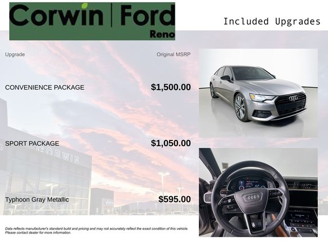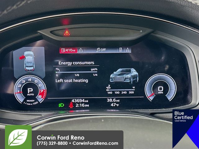 This Audi A6 is well equipped and includes these key features and benefits, All Wheel Drive, Moonroof, Heated Seats, Blind-Spot Monitors, Lane Keeping Assist, Navigation System, Touchscreen Controls, Backup Camera, Keyless Access with Push Button Start, Automatic Headlights, Voice Recognition, Bluetooth Hands-Free, Low Miles, Collision Warning System, Audi Phone Box w/Wireless Charging, Audi Side Assist w/Pre Sense Rear, Audi Virtual Cockpit, Convenience Package, Heated 3-Spoke Multifunction Steering Wheel, Navigation system: MMI Navigation plus, Radio: MMI Navigation Plus w/MMI Touch, Sport Package, Sport Suspension (20mm Drop), Top View Camera System w/Virtual 360 View, Wheels: 20" Bi-Color 5-V-Spoke-Design. Priced below KBB Fair Purchase Price! Available at Corwin Ford Reno located at 11111 South Virginia St.