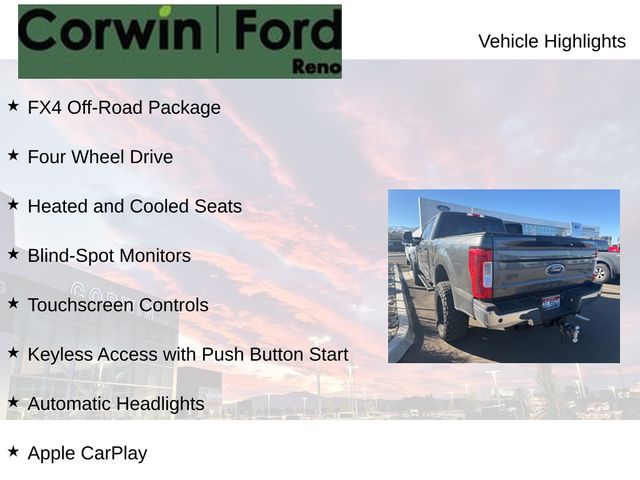 Recent Arrival! This Ford F-250SD is well equipped and includes these key features and benefits, FX4 Off-Road Package, Four Wheel Drive, Heated and Cooled Seats, Blind-Spot Monitors, Touchscreen Controls, Keyless Access with Push Button Start, Automatic Headlights, Apple CarPlay, Android Auto, Ambient Lighting, Automatic High Beam, Easy Entry®/Exit Memory Driver's Seat Feature, Fully automatic headlights, Intelligent Access w/Push-Button Start, Lariat Ultimate Package, LED Box Lighting, Memory Power-Adjustable Pedals, Power Heated/Cooled Driver Seat w/Memory, Power Heated/Cooled Passenger Seat, Power Telescoping/Tilt Steering Wheel/Column, PowerScope Trailer Tow Mirrors w/Memory, Remote Start System, Remote Tailgate Release, Tailgate Step & Handle, Twin Panel Power Moonroof, Voice-Activated Navigation. CARFAX One-Owner. Priced below KBB Fair Purchase Price! Available at Corwin Ford Reno located at 11111 South Virginia St.