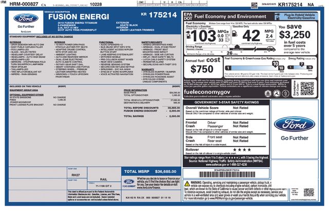 2019 Ford Fusion Energi Titanium FWD I4 Hybrid Agate Black Certified.