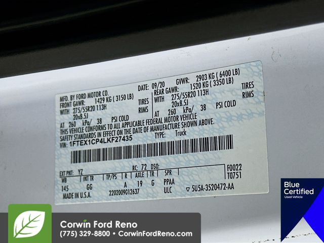 This Ford F-150 is well equipped and includes these key features and benefits, Backup Camera, Automatic Headlights, Voice Recognition, Bluetooth Hands-Free, Collision Warning System, 20" Machined-Aluminum Wheels, 4.2" Productivity Screen in Instrument Cluster, Body-Color Front & Rear Bumpers, Body-Color Surround w/Black Mesh Insert Grille, Box Side Decals, Cruise Control, Driver/Passenger Seat Back Pocket, Equipment Group 101A Mid, Fog Lamps, FordPass Connect (4G), Manual Driver/Passenger Lumbar, Rear Window Defroster, Rear Window Fixed Privacy Glass, STX Appearance Package, SYNC, SYNC 3, Unique Sport Cloth 40/20/40 Front-Seats, Wheels: 17" Silver Painted Aluminum, XL Power Equipment Group, XL Sport Appearance Package. CARFAX One-Owner. Priced below KBB Fair Purchase Price! Available at Corwin Ford Reno located at 11111 South Virginia St.