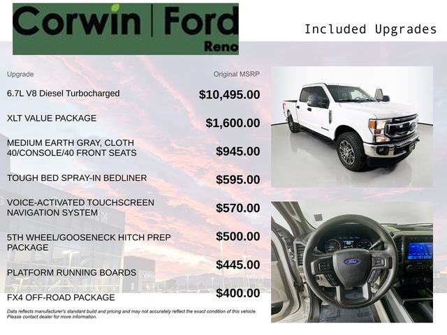 Recent Arrival! This Ford F-250SD is well equipped and includes these key features and benefits, FX4 Off-Road Package, Four Wheel Drive, Blind-Spot Monitors, Lane Keeping Assist, Navigation System, Touchscreen Controls, Backup Camera, Automatic Headlights, Voice Recognition, Bluetooth Hands-Free, Factory Tow Package, Collision Warning System, 5th Wheel/Gooseneck Hitch Prep Package, 8-Way Power Driver's Seat, Autolock/Auto Unlock, FX4 Off-Road Package, GVWR: 10,000 lb Payload Package, Halogen Fog Lamps, Hill Descent Control, Navigation System, Off-Road Specifically Tuned Shock Absorbers, Order Code 603A, Power-Adjustable Pedals, Reverse Sensing System, SecuriCode Driver's Side Keyless Entry Keypad, Unique FX4 Off-Road Box Decal, XLT Value Package. CARFAX One-Owner. Available at Corwin Ford Reno located at 11111 South Virginia St.