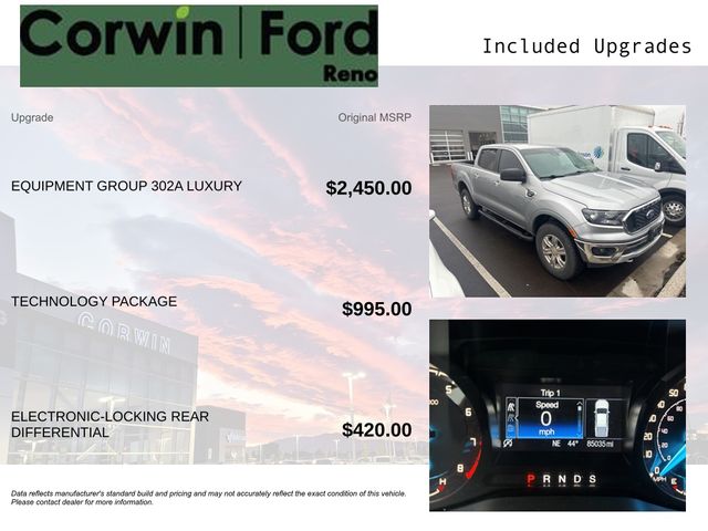 Recent Arrival! This Ford Ranger is well equipped and includes these key features and benefits, Adaptive Cruise Control, Heated Seats, Blind-Spot Monitors, Lane Keeping Assist, Navigation System, Touchscreen Controls, Backup Camera, Automatic Headlights, Apple CarPlay, Android Auto, Voice Recognition, Bluetooth Hands-Free, Collision Warning System, 8-Way Pwr Driver & Pass Heated Seats w/Pwr Lumbar, Adaptive Cruise Control, Auto-Dimming Rear-View Mirror, Body-Color Wheel-Lip Molding, Chrome Appearance Package, Chrome Door & Tailgate Handles, Chrome Exhaust Tip, Chrome Front & Rear Bumpers, Chrome Tow Hooks, Equipment Group 302A Luxury, Forward Sensing System, Leather-Wrapped Shifter, Leather-Wrapped Steering Wheel, Manual-Sliding Rear-Window, Navigation, Navigation System, Power-Folding Sideview Mirrors w/Power Glass, Remote Start, Sport Appearance Package, Technology Package, Unique Chrome Grille, Wheels: 17" Chrome-Like PVD. Priced below KBB Fair Purchase Price! Available at Corwin Ford Reno located at 11111 South Virginia St.