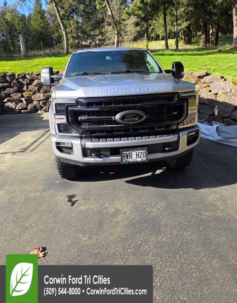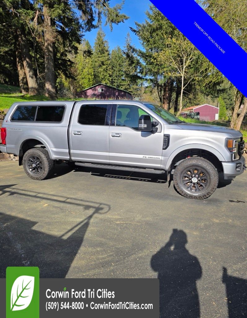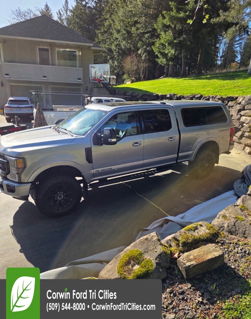 Our Diesel-powered, Certified Pre-Owned, Low Mileage 2021 Ford F-250 Super Duty Lariat Crew Cab 4X4 with the Black Appearance, Tremor Off-Road and Ultimate Packages in Iconic Silver is a strong, tough foundation for your next job! Motivated by a TurboCharged 6.7 Liter PowerStroke Diesel V8 supplying 475hp and 1,050lb-ft of torque paired to a 10 Speed Automatic transmission for high capability ratings you can count on. This Four Wheel Drive truck also rewards you with composed handling even when hard at work, and it's a real head-turner with its bold design. Just check out the Black Appearance Pack's rear wheel well liners, 20-inch gloss-black wheels with 35-inch tires, spray-on Bedliner, fog lamps, heated power mirrors, a power-locking tailgate, and Ford's BoxLink cargo-management system. Running boards and a body color topper have also been installed.
