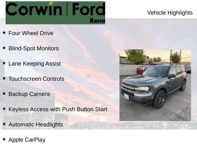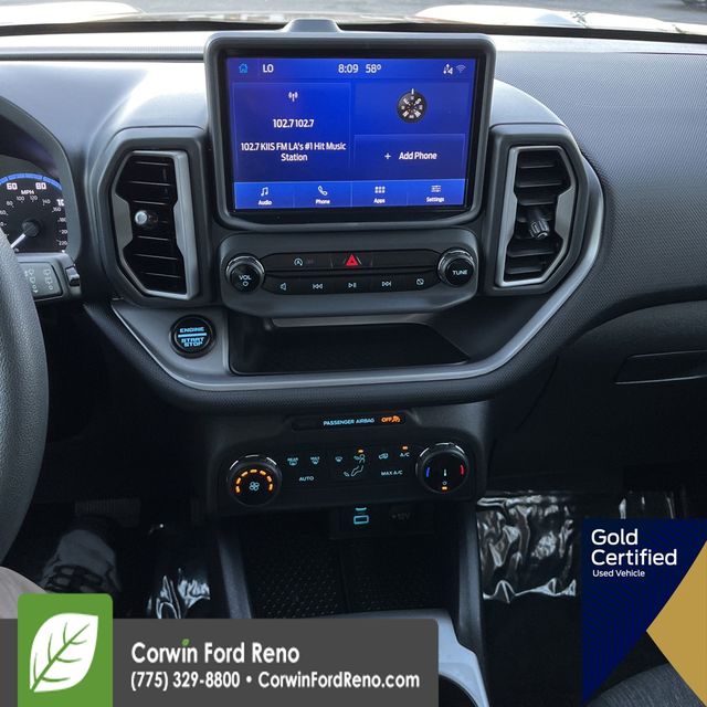 Recent Arrival! This Ford Bronco Sport is well equipped and includes these key features and benefits, Four Wheel Drive, Blind-Spot Monitors, Lane Keeping Assist, Touchscreen Controls, Backup Camera, Keyless Access with Push Button Start, Automatic Headlights, Apple CarPlay, Android Auto, Voice Recognition, Bluetooth Hands-Free, FORD CERTIFIED: 12Mo/12K Comprehensive Warranty,7 Yr/100K Powertrain Warranty,, 172-pt inspection, Roadside assistance, trip-interruption services, rental car benefits, Collision Warning System. Priced below KBB Fair Purchase Price! Available at Corwin Ford Reno located at 11111 South Virginia St.