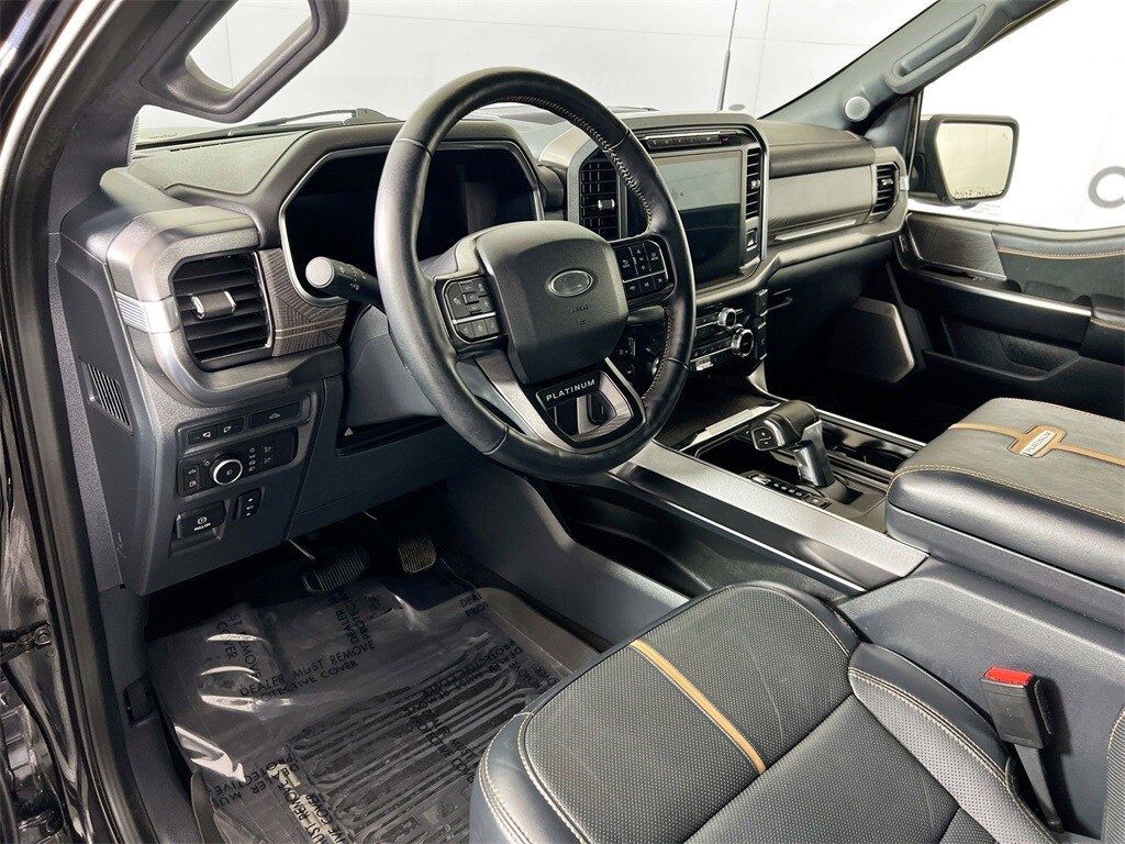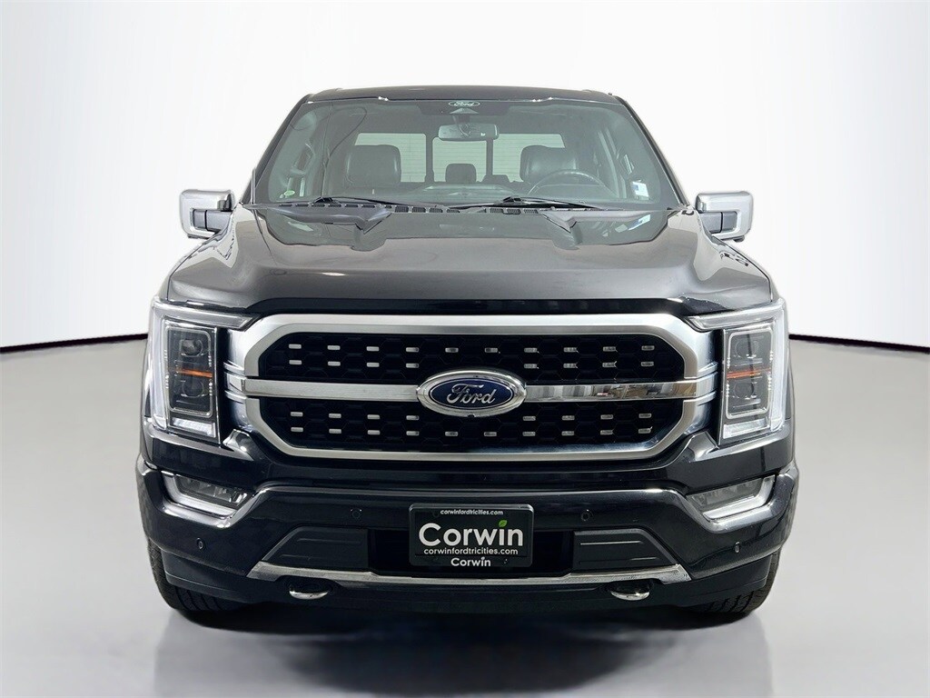 Our Accident Free, Certified Pre-Owned 2022 Ford F-150 Platinum SuperCrew 4X4 helps make a powerful statement even just standing still in Agate Black Metallic! Motivated by a Twin-TurboCharged 3.5 Liter PowerBoost V6 and an Electric Motor offering a combined 430hp to a 10 Speed SelectShift Automatic transmission for robust capability. This Four Wheel Drive hybrid truck also returns nearly 23mpg on the highway and has a ProPower Onboard generator for another premium advantage. Getting noticed is no problem with our F-150's bold grille, LED lighting, fog lamps, power running boards, 20-inch alloy wheels, twin panel sunroof, spray-on bedliner, and heated power-folding mirrors.