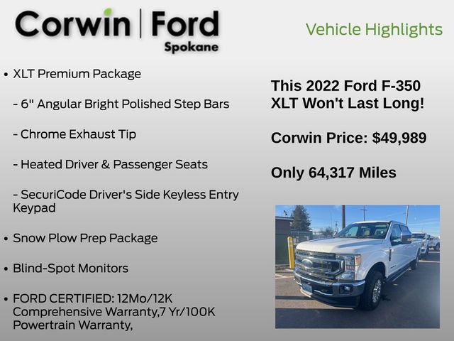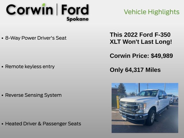 Ford's intelligent safety measures are on the job to boost your peace of mind with a backup camera, automatic braking, forward collision warning, a blind-spot monitor, rear cross-traffic alert, and more. Our F-350 XLT earns the SuperDuty seal of approval with features like those! Save this Page and Call for Availability. We Know You Will Enjoy Your Corwin Ford Spokane Test Drive Towards Ownership! See us today at Corwin Ford Spokane. Family owned for over 100 years! Excellent selection of New and Used vehicles, Financing options. Serving Spokane, Pasco, Kennewick, Richland, Walla Walla, Hermiston, Umatilla, Yakima, Sunnyside, Grandview, Dayton, Prescott, Denton County, Franklin County, Yakima County, Spokane County, Adams County, Grant County, and the Greater Columbia Basin. *All Prices plus applicable sales tax, license, and a negotiable documentary service fee up to $200 may be added to sales price or capitalized cost of the vehicle. One vehicle unless otherwise noted and subject to prior sale without notice. While supplies last. EPA mileage estimates are for newly manufactured vehicles only. Your actual mileage will vary depending on how you drive and maintain your vehicle.