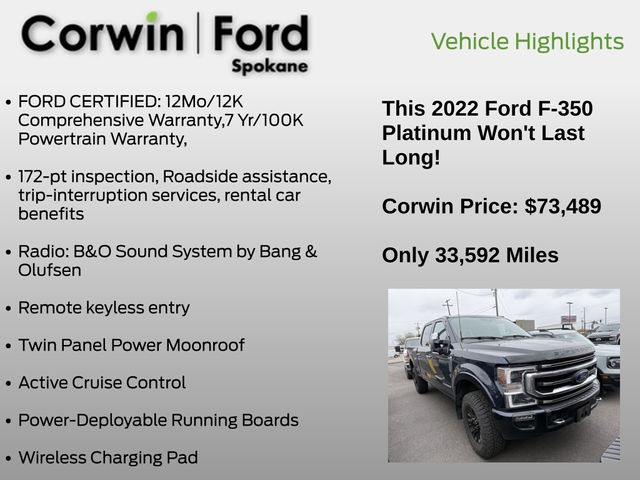 Discover the ultimate in power, capability, and comfort with this 2022 Ford F-350SD Platinum. This exceptional truck is built to handle the toughest jobs and the most demanding adventures, all while providing a premium driving experience.
