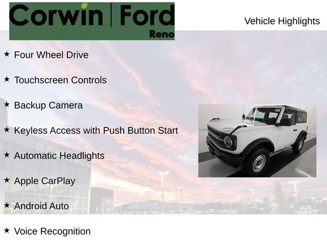 Recent Arrival! This Ford Bronco is well equipped and includes these key features and benefits, Four Wheel Drive, Touchscreen Controls, Backup Camera, Keyless Access with Push Button Start, Automatic Headlights, Apple CarPlay, Android Auto, Voice Recognition, Bluetooth Hands-Free, Low Miles, Collision Warning System, Convertible HardTop, Equipment Group 101A Standard Package. CARFAX One-Owner. Available at Corwin Ford Reno located at 11111 South Virginia St.