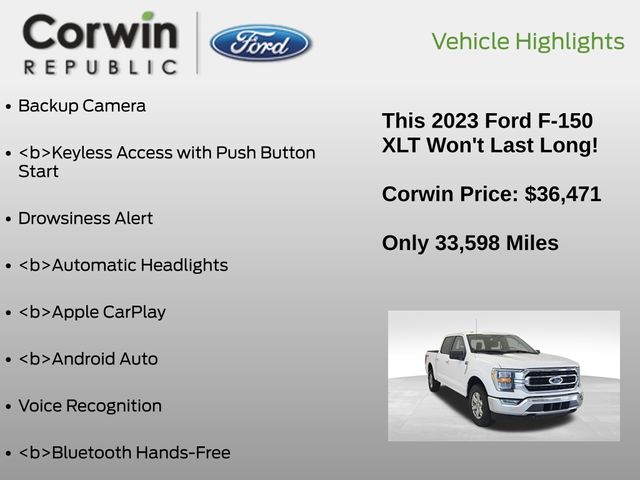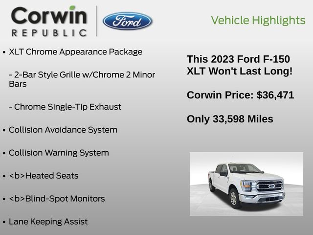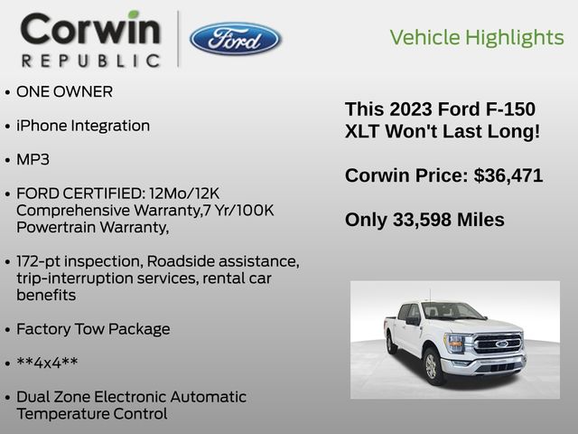 This Ford F-150 is well equipped and includes these key features and benefits, Collision Avoidance System, Collision Warning System, *Heated Seats, Blind-Spot Monitors, Lane Keeping Assist, Touchscreen Controls, Backup Camera, Keyless Access with Push Button Start, Drowsiness Alert, Automatic Headlights, Apple CarPlay, Android Auto, Voice Recognition, Bluetooth Hands-Free, ONE OWNER, iPhone Integration, MP3, FORD CERTIFIED: 12Mo/12K Comprehensive Warranty,7 Yr/100K Powertrain Warranty,, 172-pt inspection, Roadside assistance, trip-interruption services, rental car benefits, Factory Tow Package, **4x4**, 4WD, 10-Way Power Driver & Passenger Seats, 8" Productivity Screen in Instrument Cluster, ABS brakes, Alloy wheels, Class IV Trailer Hitch Receiver, Compass, Dual Zone Electronic Automatic Temperature Control, Electronic Stability Control, Equipment Group 302A High, Heated door mirrors, Heated Front Seats, Illuminated entry, Integrated Trailer Brake Controller, Intelligent Access w/Push Button Start, LED Reflector Headlamps, LED Sideview Mirror Spotlights, Low tire pressure warning, Onboard 400W Outlet, Power Glass Heated Sideview Mirrors, Pro Trailer Backup Assist & Pro Trailer Hitch Assist, Rear Under-Seat Storage, Remote keyless entry, Remote Start System w/Remote Tailgate Release, SYNC 4 w/Enhanced Voice Recognition, Traction control, Trailer Tow Package, Wrapped Steering Wheel, XLT Chrome Appearance Package, Zone Lighting. Priced below KBB Fair Purchase Price! CARFAX One-Owner. Clean CARFAX.