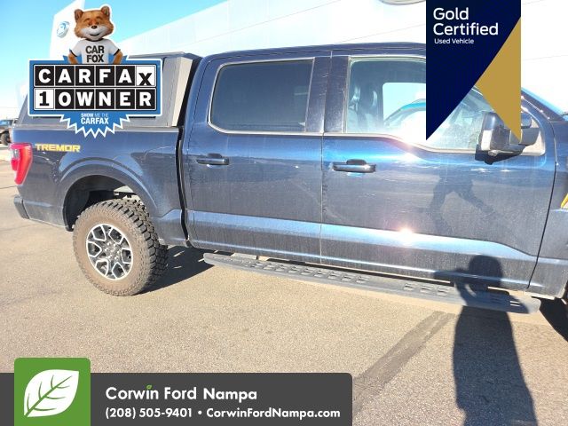 Tuned for the trail, our Certified, Accident Free, One Owner 2023 Ford F-150 Tremor SuperCrew 4X4 in Antimatter Blue Metallic is a top choice for adventure! Powered by a Twin-TurboCharged 3.5 Liter EcoBoost V6 that generates 400hp for a 10 Speed SelectShift Automatic transmission. Off-road shocks and exclusive Tremor suspension components help handle rugged terrain, and this Four Wheel Drive truck returns nearly 20mpg on the highway. You've got plenty of strength for towing and hauling, too! Mighty and muscular, our F-150 makes a bold impression by showing off a unique grille with orange accents, an aggressive Tremor hood, LED lighting, step bars, skid plates, a topper, a SecuriCode keypad, and eye-catching graphics.