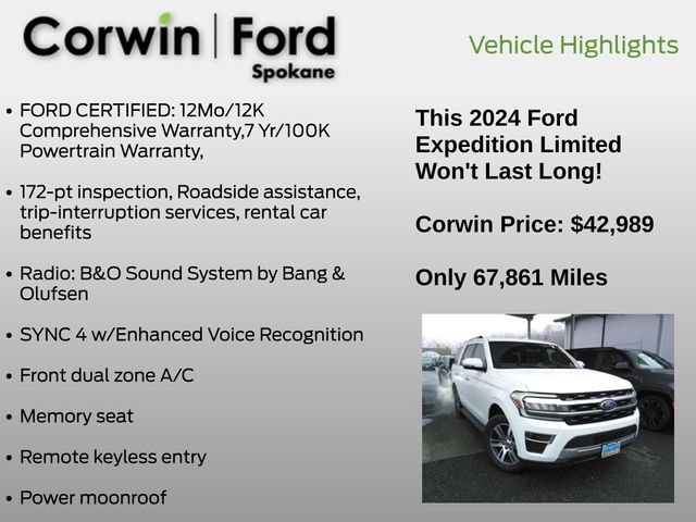 As a Ford Certified pre-owned vehicle, this Expedition Limited has undergone a rigorous 172-point inspection and comes with an impressive warranty package, including a 12-month/12,000-mile comprehensive warranty and an 84-month/100,000-mile powertrain warranty. Additionally, you'll receive 22,000 FordPass Rewards Points to use towards your first two maintenance visits, ensuring your ownership experience is seamless and worry-free.