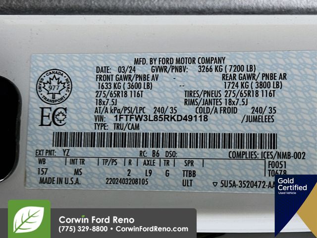 This Ford F-150 is well equipped and includes these key features and benefits, FX4 Off-Road Package, Four Wheel Drive, 360 degree Camera, Blind-Spot Monitors, Lane Keeping Assist, Navigation System, Touchscreen Controls, Backup Camera, Automatic Headlights, Apple CarPlay, Android Auto, Voice Recognition, Bluetooth Hands-Free, FORD CERTIFIED: 12Mo/12K Comprehensive Warranty,7 Yr/100K Powertrain Warranty,, 172-pt inspection, Roadside assistance, trip-interruption services, rental car benefits, Factory Tow Package, Collision Warning System, 4x4 FX4 Off-Road Bodyside Decal, Equipment Group 301A Standard, FX4 Off-Road Package, Hill Descent Control, Integrated Trailer Brake Controller, Monotube Rear Shocks, Navigation system: Connected Navigation, Off-Road Tuned Front Shock Absorbers, Rock Crawl Mode, Tow/Haul Package, Tray Style Floor Liner. Priced below KBB Fair Purchase Price! Available at Corwin Ford Reno located at 11111 South Virginia St.
