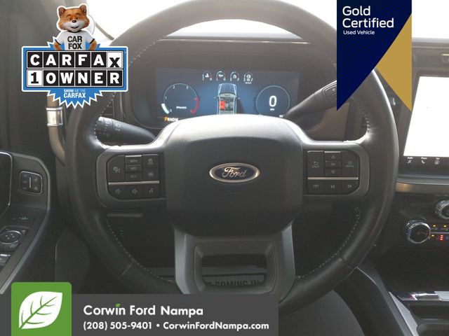 Inside, our well-equipped Lariat cabin is comfortably equipped for hard work with heated/ventilated leather power front and heated rear seats, a heated leather power steering wheel, dual-zone automatic climate control, power-adjustable pedals, 120V/400W outlets, and a power sliding rear window. Your tech tools include a 12-inch touchscreen, a 12-inch driver display, connected navigation, Apple CarPlay®/Android Auto®, WiFi compatibility, Bluetooth®, voice recognition, wireless charging, and B&O audio.