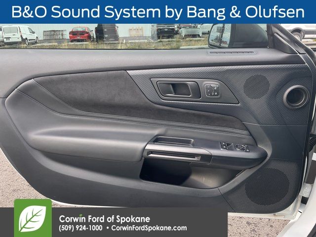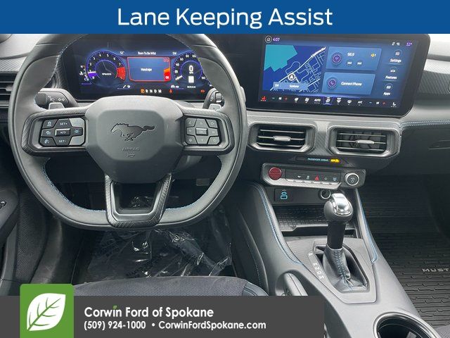 A serialized dash plaque sets off our Dark Horse Premium cabin, complemented by heated/cooled cloth power front seats, accent stitching, a heated leather flat-bottom steering wheel, dual-zone automatic climate control, keyless access/ignition, aluminum pedals, and a Titanium Anodized Blue shifter knob. Tech highlights include a 12.4-inch driver display, a 13.2-inch touchscreen, Track Apps, wireless charging, Android Auto®, Apple CarPlay®, Bluetooth, connected navigation, WiFi compatibility, and Bang & Olufsen® audio.
