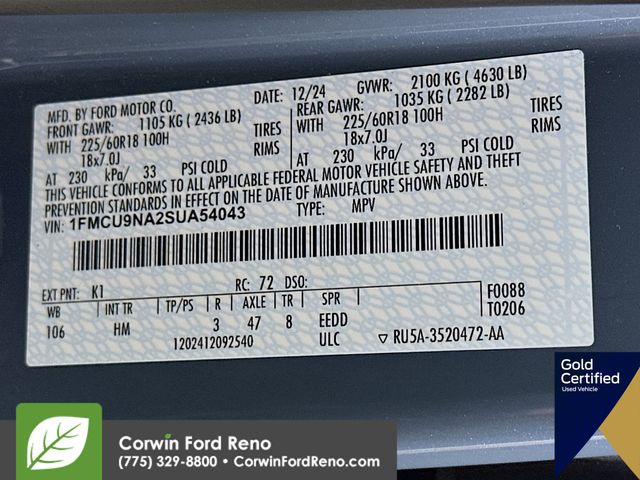 Recent Arrival! This Ford Escape is well equipped and includes these key features and benefits, All Wheel Drive, Heated Seats, Blind-Spot Monitors, Touchscreen Controls, Backup Camera, Keyless Access with Push Button Start, Automatic Headlights, Apple CarPlay, Android Auto, Voice Recognition, Bluetooth Hands-Free, FORD CERTIFIED: 12Mo/12K Comprehensive Warranty,7 Yr/100K Powertrain Warranty,, 172-pt inspection, Roadside assistance, trip-interruption services, rental car benefits, Equipment Group 401A. CARFAX One-Owner. Priced below KBB Fair Purchase Price! Available at Corwin Ford Reno located at 11111 South Virginia St.