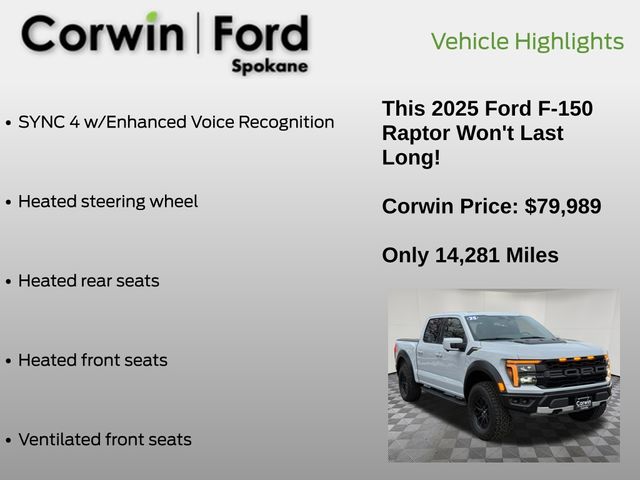 Ford helps seal the deal with smart safety from blind-spot monitoring, adaptive cruise control, automatic braking, a 360-degree camera system, a head-up display, Pro Trailer Backup Assist, and more. It's no wonder our F-150 Raptor is a top choice for truck professionals worldwide! Save this Page and Call for Availability. We Know You Will Enjoy Your Corwin Ford Spokane Test Drive Towards Ownership! See us today at Corwin Ford Spokane. Family owned for over 100 years! Excellent selection of New and Used vehicles, Financing options. Serving Spokane, Pasco, Kennewick, Richland, Walla Walla, Hermiston, Umatilla, Yakima, Sunnyside, Grandview, Dayton, Prescott, Denton County, Franklin County, Yakima County, Spokane County, Adams County, Grant County, and the Greater Columbia Basin. *All Prices plus applicable sales tax, license, and a negotiable documentary service fee up to $200 may be added to sales price or capitalized cost of the vehicle. One vehicle unless otherwise noted and subject to prior sale without notice. While supplies last. EPA mileage estimates are for newly manufactured vehicles only. Your actual mileage will vary depending on how you drive and maintain your vehicle.
