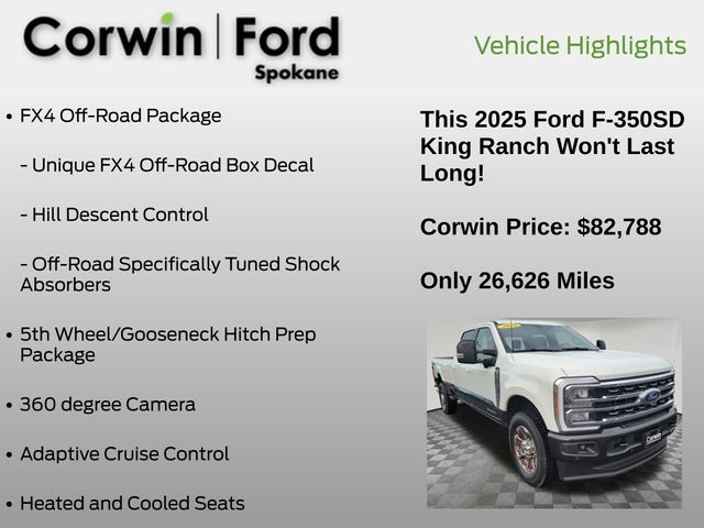 This Ford F-350SD is well equipped and includes these key features and benefits, 360 degree Camera, Adaptive Cruise Control, Heated and Cooled Seats, Blind-Spot Monitors, Touchscreen Controls, Heads-Up Display, Backup Camera, Apple CarPlay, Android Auto, FORD CERTIFIED: 12Mo/12K Comprehensive Warranty,7 Yr/100K Powertrain Warranty,, 172-pt inspection, Roadside assistance, trip-interruption services, rental car benefits, **4x4**, Max Recline Seats!, F-350 SuperDuty King Ranch, 4D Crew Cab, Power Stroke 6.7L V8 DI 32V OHV Turbodiesel, 10-Speed Automatic, 4WD, Star White Metallic Tri-Coat, 5th Wheel/Gooseneck Hitch Prep Package, FX4 Off-Road Package, Memory seat. Priced below KBB Fair Purchase Price!