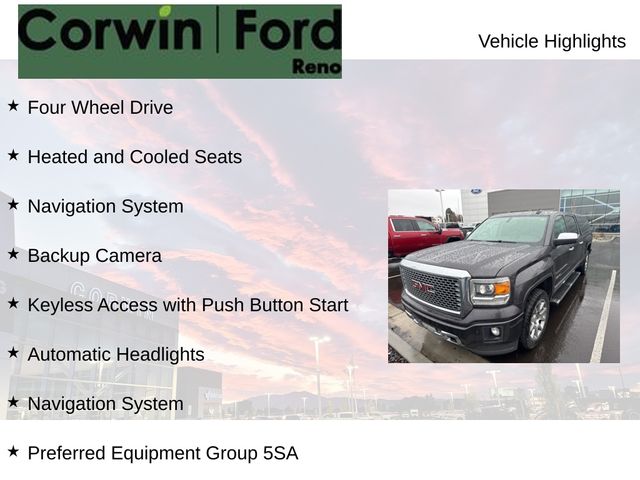 Recent Arrival! This GMC Sierra 1500 is well equipped and includes these key features and benefits, Four Wheel Drive, Heated and Cooled Seats, Navigation System, Backup Camera, Keyless Access with Push Button Start, Automatic Headlights, 110-Volt AC Power Outlet, 150 Amp Alternator, 1st & 2nd Row Color-Keyed Carpeted Floor Mats, 6" Rectangular Chromed Tubular Assist Steps, 8" Multi-Color Customizable Driver Display, Auto-Dimming Inside Rear-View Mirror, Body-Color Front Bumper, Bose Speaker System, Chrome Bodyside Moldings, Chrome Door Handles, Chrome Mirror Caps, Color-Keyed Carpeting Floor Covering, Deep-Tinted Glass, Driver & Front Passenger Illuminated Vanity Mirrors, Dual-Zone Automatic Climate Control, Electronic Autotrac Transfer Case, EZ Lift & Lower Tailgate, Front Frame-Mounted Black Recovery Hooks, Front Halogen Fog Lamps, Heated & Cooled Front Bucket Seats, Leather Wrapped Steering Wheel, Manual Tilt/Telescoping Steering Column, Navigation System, OnStar 6 Months Directions & Connections Plan, OnStar w/4G LTE, Polished Exhaust Tip, Power Adjustable Pedals, Power Folding & Adjustable Heated Outside Mirrors, Power Sliding Rear Window, Power Windows w/Driver Express Up & Down, Preferred Equipment Group 5SA, Rear 60/40 Folding Bench Seat (Folds Up), Rear Body-Color Bumper w/Bumper CornerSteps, Rear Vision Camera w/Dynamic Guide Lines, Rear Wheelhouse Liners, Remote Keyless Entry, Remote Vehicle Starter System, Single Slot CD/MP3 Player, Steering Wheel Audio Controls, Theft Deterrent System (Unauthorized Entry), Trailering Equipment, Ultrasonic Front & Rear Park Assist, Universal Home Remote. CARFAX One-Owner. Priced below KBB Fair Purchase Price! Available at Corwin Ford Reno located at 11111 South Virginia St.
