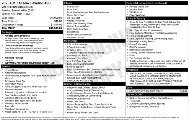Summit White 2025 GMC Acadia Elevation 4D Sport Utility AWD 2.5L DOHC 19/24 City/Highway MPG