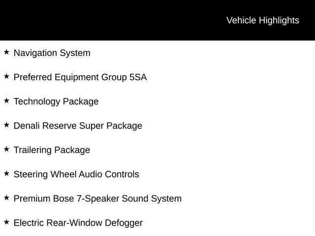 Step inside the cabin, and you'll be enveloped in a world of luxurious comfort and advanced technology. The Denali's premium leather-appointed seating, heated and ventilated front seats, and heated rear outboard seats provide exceptional comfort, while the stunning Bose sound system and intuitive infotainment system keep you entertained and connected on every journey.