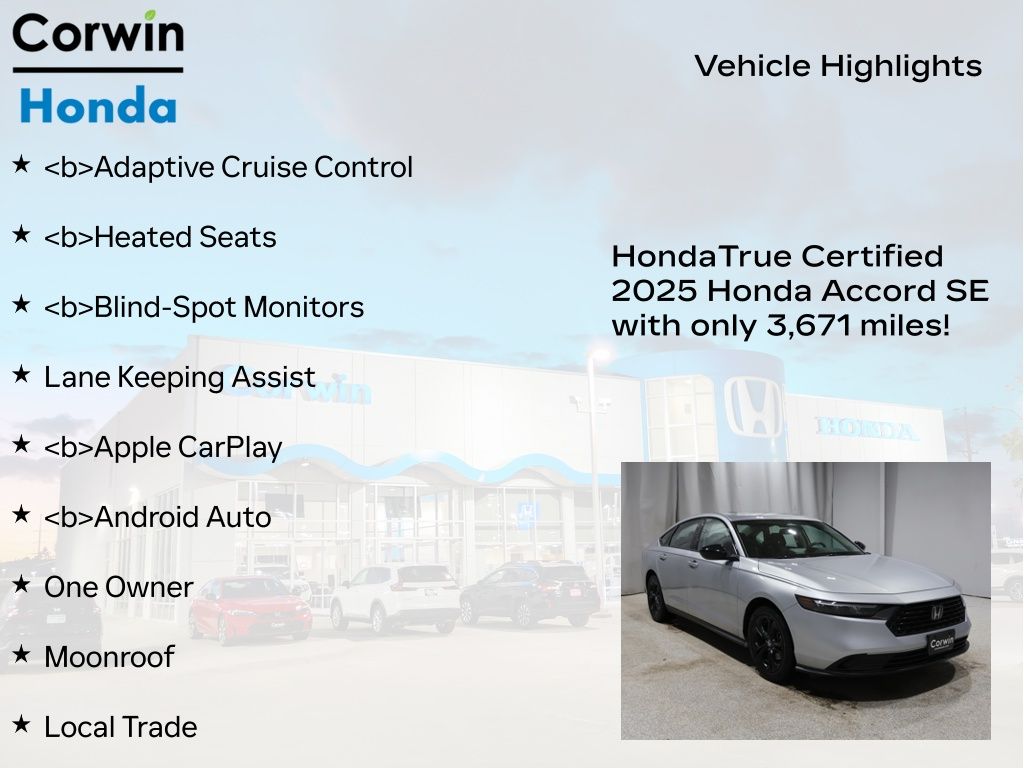 SAVE BIG IN 2026 WITH A GREAT DEAL ON ONE OF OVER 200 PRE-OWNED VEHICLE'S AT CORWIN HONDA. Recent Arrival! 2025 Solar Silver Metallic Honda Accord SE FWD Certified. CARFAX One-Owner. Clean CARFAX.