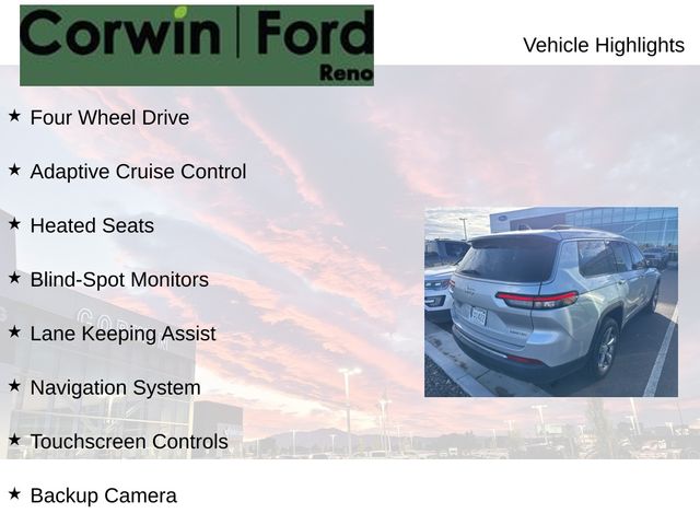 Recent Arrival! This Jeep Grand Cherokee L is well equipped and includes these key features and benefits, Four Wheel Drive, Adaptive Cruise Control, Heated Seats, Blind-Spot Monitors, Lane Keeping Assist, Navigation System, Touchscreen Controls, Backup Camera, Keyless Access with Push Button Start, Automatic Headlights, Apple CarPlay, Android Auto, Voice Recognition, Bluetooth Hands-Free, Third Row Seats, Collision Warning System, GPS Navigation, Quick Order Package 22E. CARFAX One-Owner. Priced below KBB Fair Purchase Price! Available at Corwin Ford Reno located at 11111 South Virginia St.