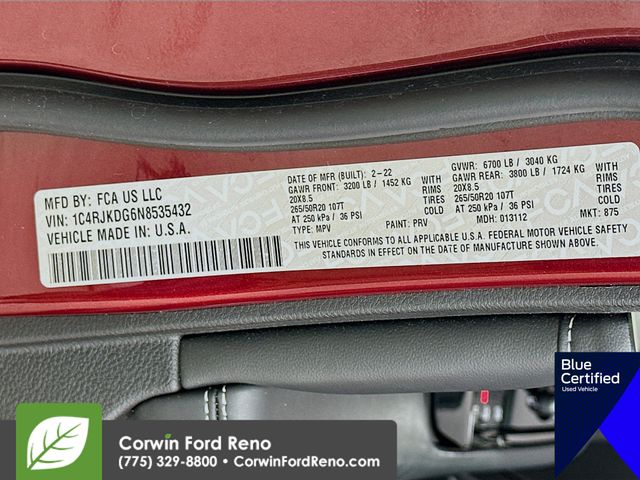Recent Arrival! This Jeep Grand Cherokee L is well equipped and includes these key features and benefits, Four Wheel Drive, Adaptive Cruise Control, Heated and Cooled Seats, Panoramic Moonroof, Heated Seats, Blind-Spot Monitors, Lane Keeping Assist, Navigation System, Touchscreen Controls, Backup Camera, Keyless Access with Push Button Start, Automatic Headlights, Apple CarPlay, Android Auto, Voice Recognition, Bluetooth Hands-Free, Low Miles, Third Row Seats, Collision Warning System, 2nd Row Manual Window Shades, ATC w/4 Zone Temp Control, Driver Power Seat Back Massage, Front Passenger Power Seat Back Massage, Luxury Tech Group IV, Nappa Leather Seats (TL), Navigation System, Passenger Seat Memory, Power Adjust 12-Way Driver Seat, Power Adjust 12-Way Front Passenger Seat, Quick Order Package 22N, Rearview Autodim Digital Display Mirror, Wireless Charging Pad. CARFAX One-Owner. Priced below KBB Fair Purchase Price! Available at Corwin Ford Reno located at 11111 South Virginia St.