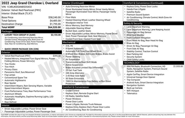 2022 Jeep Grand Cherokee L Overland 4WD 3.6L V6 24V VVT Velvet Red Pearlcoat Certified.