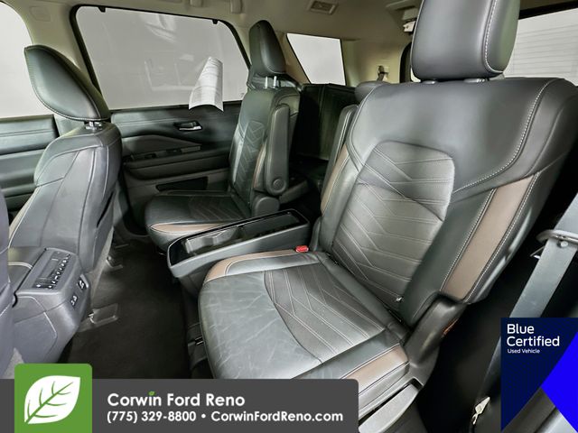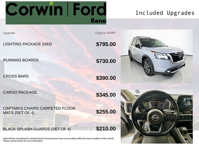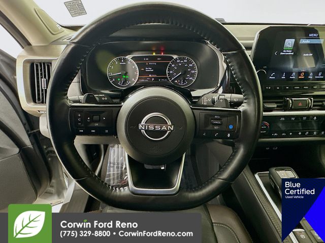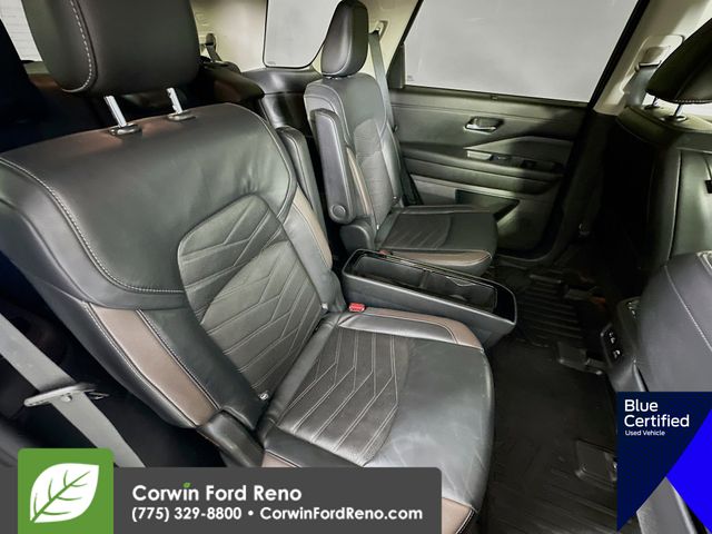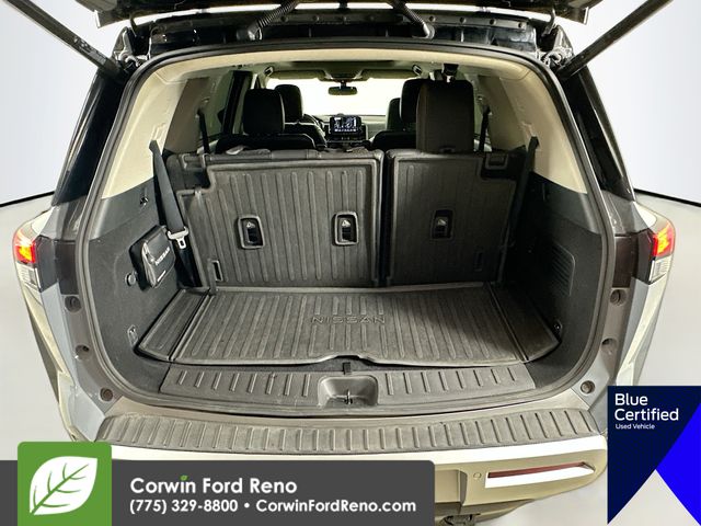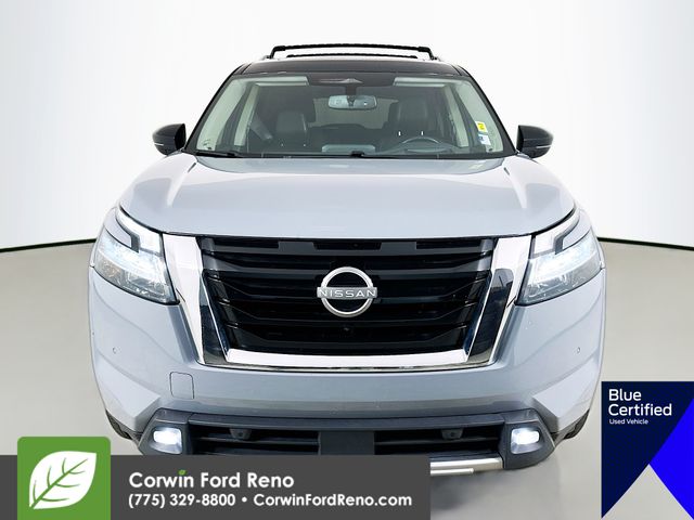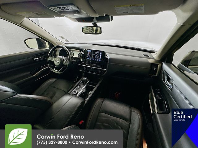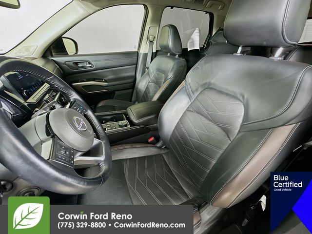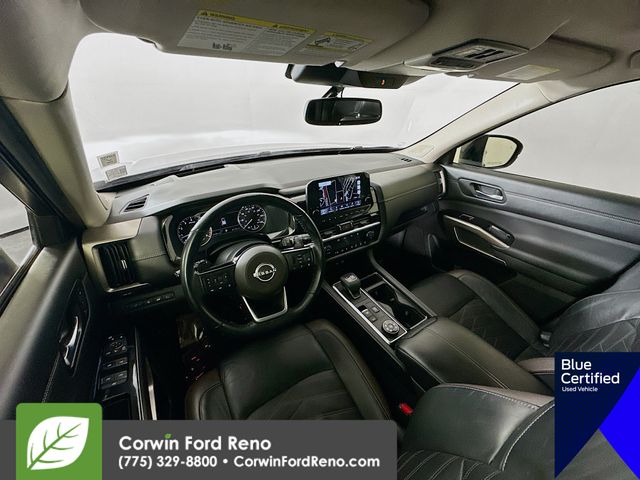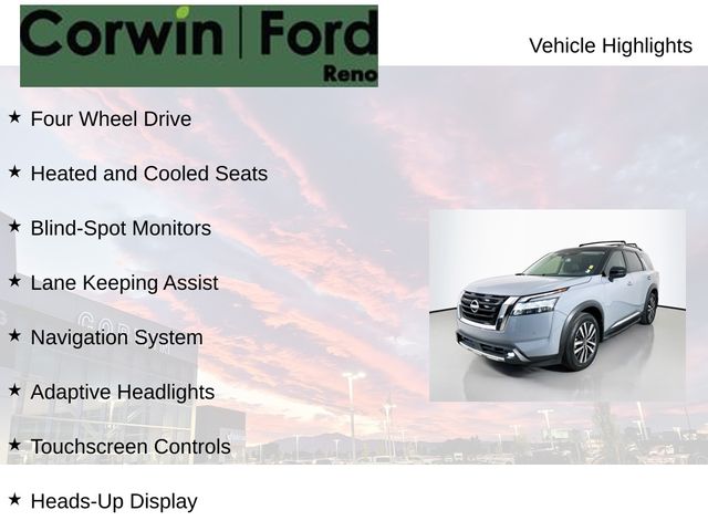 Recent Arrival! This Nissan Pathfinder is well equipped and includes these key features and benefits, Four Wheel Drive, Heated and Cooled Seats, Blind-Spot Monitors, Lane Keeping Assist, Navigation System, Adaptive Headlights, Touchscreen Controls, Heads-Up Display, Backup Camera, Keyless Access with Push Button Start, Automatic Headlights, Apple CarPlay, Android Auto, Voice Recognition, Bluetooth Hands-Free, Third Row Seats, Collision Avoidance System, Collision Warning System, Illuminated Kick Plate, Lighting Package (N93), Welcome Lighting. CARFAX One-Owner. Available at Corwin Ford Reno located at 11111 South Virginia St.