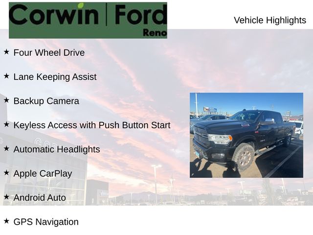 Recent Arrival! This Ram 2500 is well equipped and includes these key features and benefits, Four Wheel Drive, Lane Keeping Assist, Backup Camera, Keyless Access with Push Button Start, Automatic Headlights, Apple CarPlay, Android Auto, 2nd Row In Floor Storage Bins, Auto High Beam Headlamp Control, Black Interior Accents, Body Color Door Handles, Body Color Grille Surround, Exterior Mirrors w/Memory, Foam Bottle Insert (Door Trim Panel), Front Performance Tuned Shock Absorbers, GPS Navigation, Hill Descent Control, Laramie Level C Equipment Group (DISC), Mirror-Mounted Aux Reverse Lamps, Off Road Decal, Off Road Package, Painted Front Bumper, Painted Rear Bumper, Power Adjustable Pedals w/Memory, Power Multi-Function Manual Folding Mirrors, Radio/Driver Seat/Mirrors/Pedals Memory, Rain Sensitive Windshield Wipers, Rear Performance Tuned Shock Absorbers, Remote Tailgate Release, Sport Appearance Package, Sport Decal, Tow Hooks, Ventilated Front Seats. CARFAX One-Owner. Available at Corwin Ford Reno located at 11111 South Virginia St.