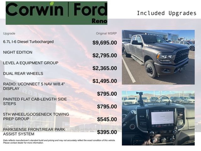 Recent Arrival! This Ram 3500 is well equipped and includes these key features and benefits, Four Wheel Drive, Navigation System, Touchscreen Controls, Backup Camera, Keyless Access with Push Button Start, Automatic Headlights, Apple CarPlay, Android Auto, Voice Recognition, Bluetooth Hands-Free, Factory Tow Package, Collision Warning System, 2nd Row In Floor Storage Bins, 6000# Front Axle w/Hub Ext, Auto-Dimming Rear-View Mirror, Black Exterior Truck Badging, Black Headlamp Bezels, Black Interior Accents, Black Ram Head Tailgate Badge, Black Tail Lamp Bezels, Black Wheel Center Hub, Body Color Door Handles, Body Color Grille Surround, Box & Rear Fender Clearance Lamps, Bright Wheel Skins, Center Hub, Clearance Lamps, Dual Glove Boxes, Dual Rear Wheels, Foam Bottle Insert (Door Trim Panel), Footwell Courtesy Lamp, Front Fog Lamps, Glove Box Lamp, GPS Navigation, Grille-Gloss Black Nostrils/Molded in Color Black, Leather Wrapped Steering Wheel, Level A Equipment Group, Locking Lower Glove Box, Night Edition, Painted Front Bumper, Painted Rear Bumper, ParkSense Front/Rear Park Assist System, Power Adjustable Pedals, Premium Cloth 40/20/40 Bench Seat, Quick Order Package 2HZ Big Horn, Rear Dome w/On/Off Switch Lamp, Rear Wheelhouse Liners, Steering Wheel Mounted Audio Controls, Sun Visors w/Illuminated Vanity Mirrors, Universal Garage Door Opener, Wheels: 17" x 6.0" Steel Chrome Clad, Wheels: 18" x 8.0" Polished Aluminum. CARFAX One-Owner. Available at Corwin Ford Reno located at 11111 South Virginia St.
