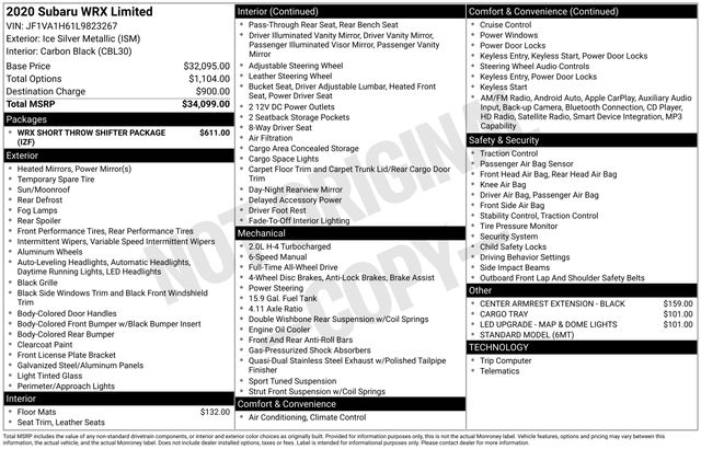 Discover the exhilarating performance and premium features of this 2020 Subaru WRX Limited. With its powerful 2.0L DOHC Intercooled Turbocharged engine, 6-speed manual transmission, and Subaru's renowned Symmetrical All-Wheel Drive system, this WRX is engineered to deliver an unforgettable driving experience.