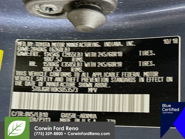 2019 Toyota Highlander Hybrid XLE AWD 3.5L V6 DOHC 24V Shoreline Blue Pearl Certified.
