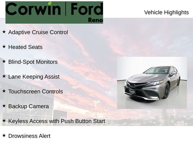 Recent Arrival! This Toyota Camry is well equipped and includes these key features and benefits, Adaptive Cruise Control, Heated Seats, Blind-Spot Monitors, Lane Keeping Assist, Touchscreen Controls, Backup Camera, Keyless Access with Push Button Start, Drowsiness Alert, Automatic Headlights, Apple CarPlay, Android Auto, Low Miles. CARFAX One-Owner. Priced below KBB Fair Purchase Price! Available at Corwin Ford Reno located at 11111 South Virginia St.