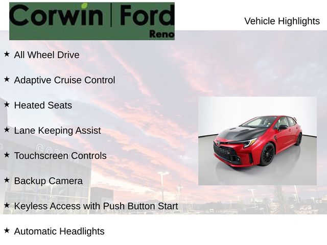 Recent Arrival! This Toyota GR Corolla is well equipped and includes these key features and benefits, All Wheel Drive, Adaptive Cruise Control, Heated Seats, Lane Keeping Assist, Touchscreen Controls, Backup Camera, Keyless Access with Push Button Start, Automatic Headlights, Apple CarPlay, Android Auto, Voice Recognition, Bluetooth Hands-Free, Low Miles, Collision Warning System, ABS brakes, Active Cruise Control, Alloy wheels, Cold Weather Package, Compass, Electronic Stability Control, Heated Front Seats, Heated Steering Wheel, Illuminated entry, Low tire pressure warning, Qi-Compatible Wireless Smartphone Charging, Radio: Premium Audio w/8 JBL Speakers & Amplifier, Remote keyless entry, Technology Package, Traction control. Priced below KBB Fair Purchase Price! Available at Corwin Ford Reno located at 11111 South Virginia St.