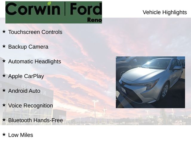 Recent Arrival! This Toyota Corolla is well equipped and includes these key features and benefits, Touchscreen Controls, Backup Camera, Automatic Headlights, Apple CarPlay, Android Auto, Voice Recognition, Bluetooth Hands-Free, Low Miles, Collision Warning System. CARFAX One-Owner. Available at Corwin Ford Reno located at 11111 South Virginia St.
