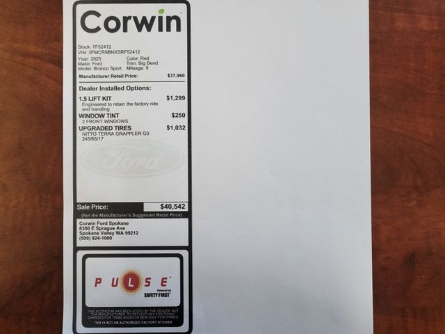 Ford charts a safer course forward with features such as automatic emergency braking, adaptive cruise control, blind-spot monitoring, lane-keeping assistance, a rearview camera, and more. Our Bronco Sport Big Bend embodies a bold spirit of adventure! Save this Page and Call for Availability. We Know You Will Enjoy Your Corwin Ford Spokane Test Drive Towards Ownership! See us today at Corwin Ford Spokane. Family owned for over 100 years! Excellent selection of New and Used vehicles, Financing options. Serving Spokane, Pasco, Kennewick, Richland, Walla Walla, Hermiston, Umatilla, Yakima, Sunnyside, Grandview, Dayton, Prescott, Denton County, Franklin County, Yakima County, Spokane County, Adams County, Grant County, and the Greater Columbia Basin. *All Prices plus applicable sales tax, license, and a negotiable documentary service fee up to $200 may be added to sales price or capitalized cost of the vehicle. One vehicle unless otherwise noted and subject to prior sale without notice. While supplies last. EPA mileage estimates are for newly manufactured vehicles only. Your actual mileage will vary depending on how you drive and maintain your vehicle. Price includes: $1000 - Final Days Mega Bonus Cash. Exp. 01/02/2026 $1150 - Bonus Customer Cash. Exp. 01/05/2026 $500 - Retail Bonus Cash. Exp. 01/05/2026 Price includes dealer added accessories.