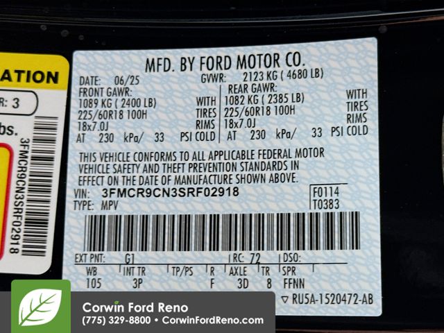 See us today at Corwin Ford Reno or call us at (775) 329-8800. Family owned for over 100 years! Excellent selection of New and Used vehicles, Financing options. Serving Reno, Carson City, Sparks, the North Valleyâs, Spanish Springs, Verdi, Virginia City, the Carson Valley, and Northern Nevada. *All Prices plus applicable sales tax, and a license, and documentary service fee of $627.75 will be added to sales price or capitalized cost of the vehicle. One vehicle unless otherwise noted and subject to prior sale without notice. While supplies last. EPA mileage estimates are for newly manufactured vehicles only. Your actual mileage will vary depending on how you drive and maintain your vehicle. Rebates included: $1000 - Bonus Customer Cash. Exp. 01/05/2026 $1000 - Final Days Mega Bonus Cash. Exp. 01/02/2026 $500 - Retail Bonus Cash. Exp. 01/05/2026 $500 - Retail Bonus Cash. Exp. 01/05/2026