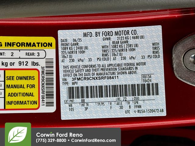 See us today at Corwin Ford Reno or call us at (775) 329-8800. Family owned for over 100 years! Excellent selection of New and Used vehicles, Financing options. Serving Reno, Carson City, Sparks, the North Valleyâs, Spanish Springs, Verdi, Virginia City, the Carson Valley, and Northern Nevada. *All Prices plus applicable sales tax, and a license, and documentary service fee of $627.75 will be added to sales price or capitalized cost of the vehicle. One vehicle unless otherwise noted and subject to prior sale without notice. While supplies last. EPA mileage estimates are for newly manufactured vehicles only. Your actual mileage will vary depending on how you drive and maintain your vehicle. Rebates included: $1000 - Bonus Customer Cash. Exp. 01/05/2026 $1000 - Final Days Mega Bonus Cash. Exp. 01/02/2026 $500 - Retail Bonus Cash. Exp. 01/05/2026 $500 - Retail Bonus Cash. Exp. 01/05/2026