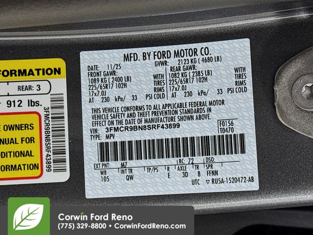See us today at Corwin Ford Reno or call us at (775) 329-8800. Family owned for over 100 years! Excellent selection of New and Used vehicles, Financing options. Serving Reno, Carson City, Sparks, the North Valleyâs, Spanish Springs, Verdi, Virginia City, the Carson Valley, and Northern Nevada. *All Prices plus applicable sales tax, and a license, and documentary service fee of $627.75 will be added to sales price or capitalized cost of the vehicle. One vehicle unless otherwise noted and subject to prior sale without notice. While supplies last. EPA mileage estimates are for newly manufactured vehicles only. Your actual mileage will vary depending on how you drive and maintain your vehicle. Rebates included: $1000 - Bonus Customer Cash. Exp. 01/05/2026 $1000 - Final Days Mega Bonus Cash. Exp. 01/02/2026 $500 - Retail Bonus Cash. Exp. 01/05/2026 $500 - Retail Bonus Cash. Exp. 01/05/2026