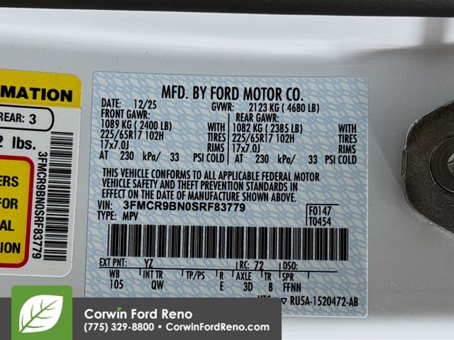 See us today at Corwin Ford Reno or call us at (775) 329-8800. Family owned for over 100 years! Excellent selection of New and Used vehicles, Financing options. Serving Reno, Carson City, Sparks, the North Valleyâs, Spanish Springs, Verdi, Virginia City, the Carson Valley, and Northern Nevada. *All Prices plus applicable sales tax, and a license, and documentary service fee of $627.75 will be added to sales price or capitalized cost of the vehicle. One vehicle unless otherwise noted and subject to prior sale without notice. While supplies last. EPA mileage estimates are for newly manufactured vehicles only. Your actual mileage will vary depending on how you drive and maintain your vehicle. Rebates included: $1000 - Bonus Customer Cash. Exp. 01/05/2026 $1000 - Final Days Mega Bonus Cash. Exp. 01/02/2026 $500 - Retail Bonus Cash. Exp. 01/05/2026 $500 - Retail Bonus Cash. Exp. 01/05/2026