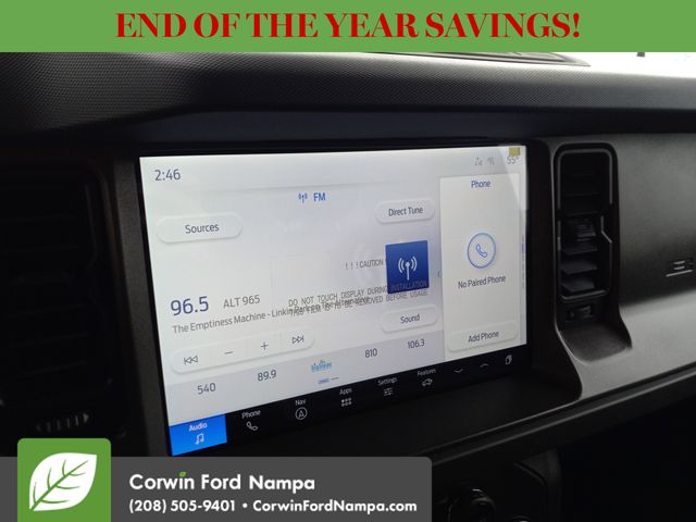 Intelligent Ford safety features can enhance your peace of mind with automatic braking, forward collision warning, a rearview camera, hill start assist, trailer sway control, tire pressure monitoring, stability and traction control, and more. You can get ready to go wild in our Bronco Big Bend! Save this Page and Call for Availability. We Know You Will Enjoy Your Test Drive Towards Ownership! Corwin Ford Nampa! Friendly service and aggressive pricing is why we are your new and pre-owned vehicle dealer serving, Nampa, Boise, Meridian, Caldwell, Kuna, Eagle, Emmett, Idaho City, Wilder, New Plymouth, Star, Middleton, Weiser, Payette, Horseshoe Bend, Mountain Home, Idaho, and surrounding states. Price does not include Tax, Title, License, $499 Documentation Fee, Subject to availability, Customer must qualify for rebates, See Dealer for Details. $1000 - Bonus Customer Cash. Exp. 01/05/2026 $1000 - Final Days Mega Bonus Cash. Exp. 01/02/2026 $1000 - Retail Bonus Cash. Exp. 01/05/2026
