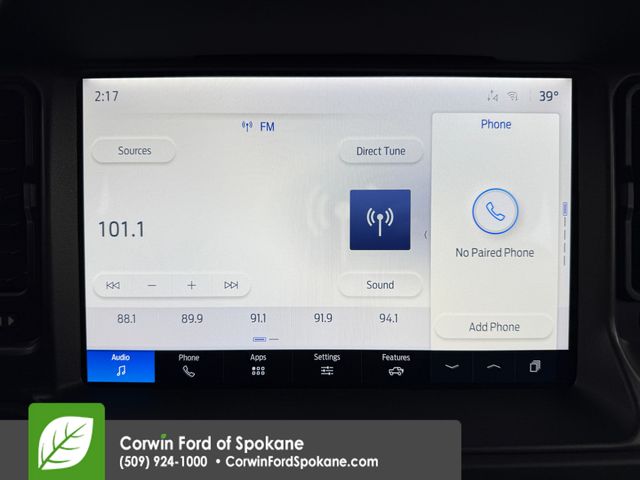 There's no need to sacrifice safety, though. Ford has your back with automatic braking, forward collision warning, a rearview camera, trailer sway control, hill start assistance, tire pressure monitoring, stability/traction control, and more. You can get ready to go wild in our Bronco! Save this Page and Call for Availability. We Know You Will Enjoy Your Corwin Ford Spokane Test Drive Towards Ownership! See us today at Corwin Ford Spokane. Family owned for over 100 years! Excellent selection of New and Used vehicles, Financing options. Serving Spokane, Pasco, Kennewick, Richland, Walla Walla, Hermiston, Umatilla, Yakima, Sunnyside, Grandview, Dayton, Prescott, Denton County, Franklin County, Yakima County, Spokane County, Adams County, Grant County, and the Greater Columbia Basin. *All Prices plus applicable sales tax, license, and a negotiable documentary service fee up to $200 may be added to sales price or capitalized cost of the vehicle. One vehicle unless otherwise noted and subject to prior sale without notice. While supplies last. EPA mileage estimates are for newly manufactured vehicles only. Your actual mileage will vary depending on how you drive and maintain your vehicle. Price includes: $2500 - Retail Customer Cash. Exp. 03/31/2026