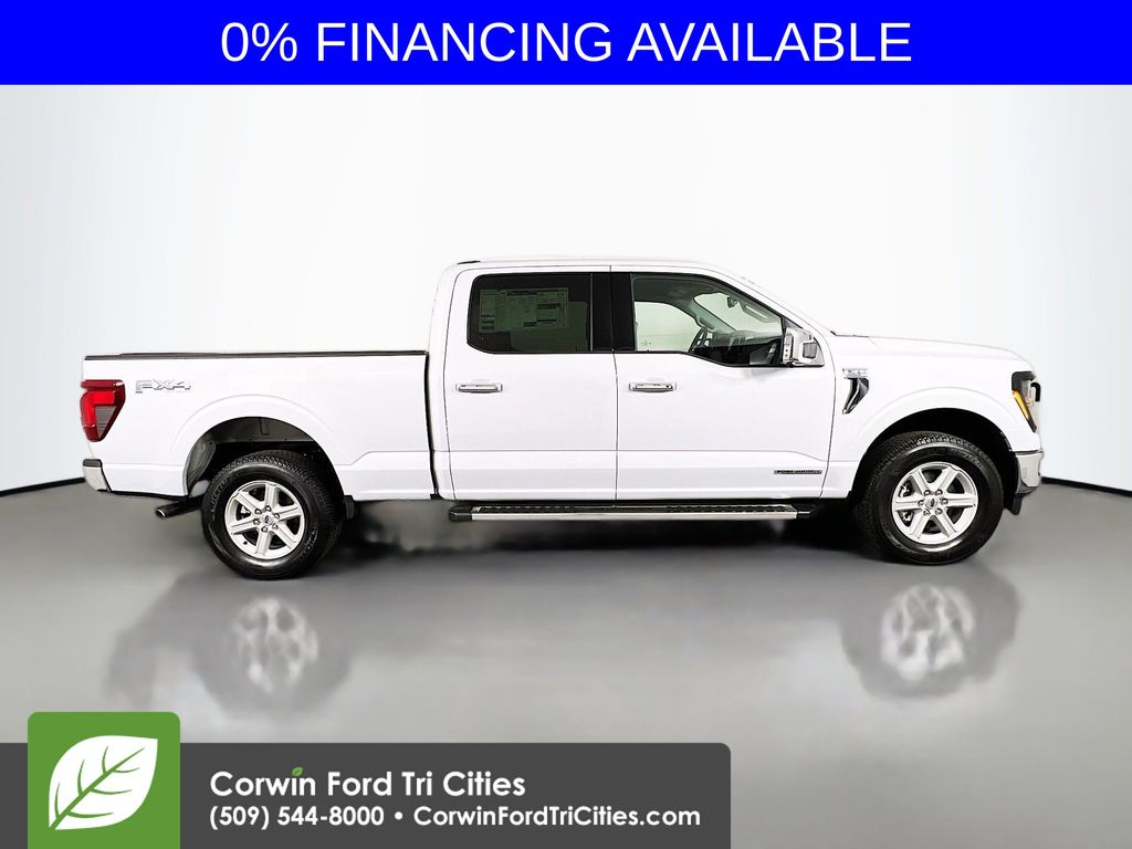 Our 2025 Ford F-150 XLT SuperCrew 4X4 with the FX4 Off-Road Pack in Space White Metallic has one job to do: Satisfy your demands! Powered by a Twin-TurboCharged 3.5 Liter PowerBoost V6 and an Electric Motor delivering a combined 430hp to a 10 Speed SelectShift Automatic transmission for rugged performance. This Four Wheel Drive truck also welcomes our FX4 Off-Road Pack to boost its capability with hill-descent control, an electronic locking differential, and Ford's Rock Crawl mode, and it returns nearly 24mpg on the highway. Additional dynamic details include LED lighting, fog lamps, chrome bumpers, chrome-like PVD wheels, running boards, an onboard generator, a Class IV trailer hitch, a spray-on bedliner, and FX4 upgrades like skid plates and a bodyside decal.