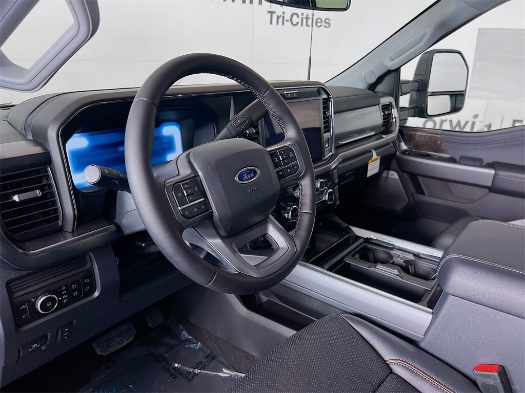 Our Lariat cabin is comfortably equipped for hard work with heated/ventilated leather power front seats, a heated leather power steering wheel, dual-zone automatic climate control, power-adjustable pedals, 120V/400W outlets, and a power sliding rear window. Your tech tools include a 12-inch touchscreen, a 12-inch driver display, connected navigation, Apple CarPlay/Android Auto, WiFi compatibility, Bluetooth, voice recognition, wireless charging, and B&O audio.