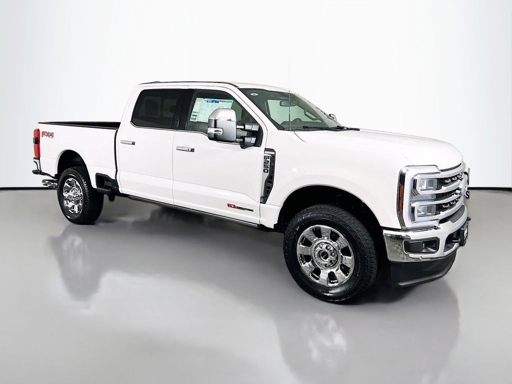 Our diesel-powered 2025 Ford F-250 Super Duty King Ranch Crew Cab 4X4 with the FX4 Off-Road Package earns its crown with stellar features and stylish Star White Metallic Tri-Coat good looks! Motivated by a TurboCharged 6.7 Liter High Output PowerStroke Diesel V8 serving up 500hp and 1200lb-ft of torque to a 10 Speed Automatic transmission. This fantastic Four Wheel Drive truck also impresses with incredible functionality, as shown by a Pro Power Onboard generator and built-in scales for payload/trailer-tongue weights. Our F-250 turns heads with aggressive 20-inch King Ranch wheels, LED lighting, power running boards, and a power tailgate.