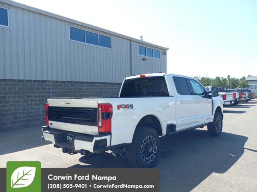 Our Diesel powered 2025 Ford F-250 Platinum Crew Cab 4X4 with the FX4 Off-Road Pack conquers large jobs with lavish luxury in Star White Metallic Tri-Coat! Motivated by a TurboCharged 6.7 Liter PowerStroke High Output Diesel V8 supplying 500hp and 1200lb-ft of torque to a 10 Speed Automatic transmission complemented by our FX4 Pack's off-road shocks, electronic locking differential, hill-descent control, skid plates, and box graphic. Standard features like a Pro Power Onboard generator, built-in payload/trailer-tongue scales, a power tailgate, power running boards, LED lighting, fog lamps, 20-inch alloy wheels, and PowerScope mirrors come together to help our Four Wheel Drive F-250 look good and work strong.