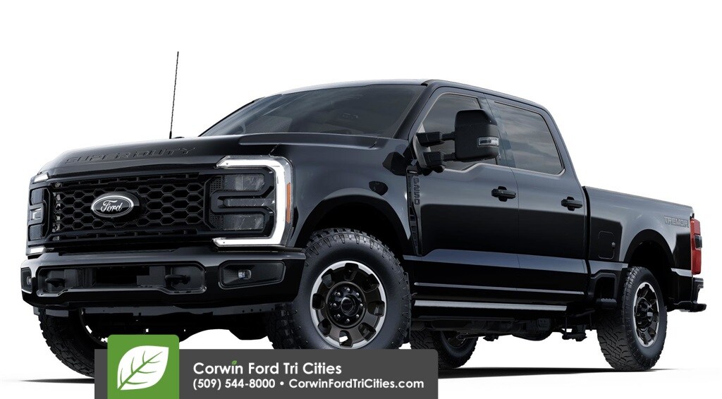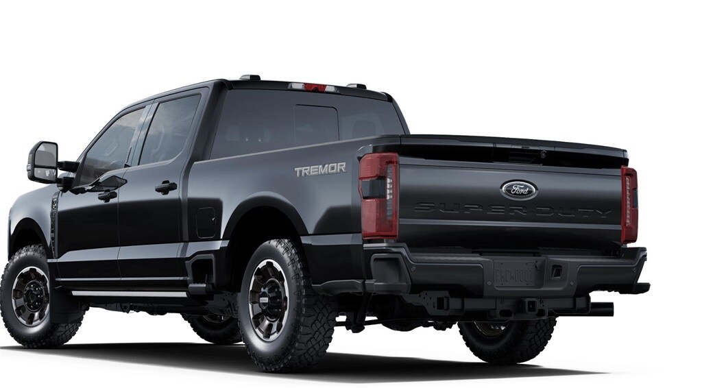 Drive our mighty 2025 Ford F-250 Super Duty Lariat Crew Cab 4X4 with the Black Appearance and Tremor Packages in a bold Agate Black Metallic design! Motivated by a 7.3 Liter V8 providing 430hp to a 10 Speed TorqShift Automatic transmission with selectable drive modes. Robust construction helps this Four Wheel Drive truck make the most of its impressive towing and payload ratings, but it really shines when you leave the pavement behind. Our Tremor Pack adds a limited-slip front diff, an electronic locking rear diff, an off-road suspension, a raised ride height, aggressive alloy wheels, off-road running boards, bold graphics, Rock Crawl mode, and Trail Control to LED lighting, fog lamps, a spray-on bedliner, a twin panel sunroof, and trailer mirrors with built-in spotlights.