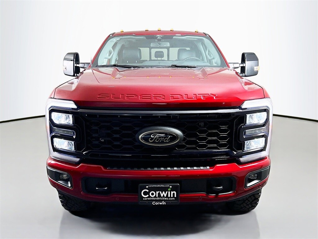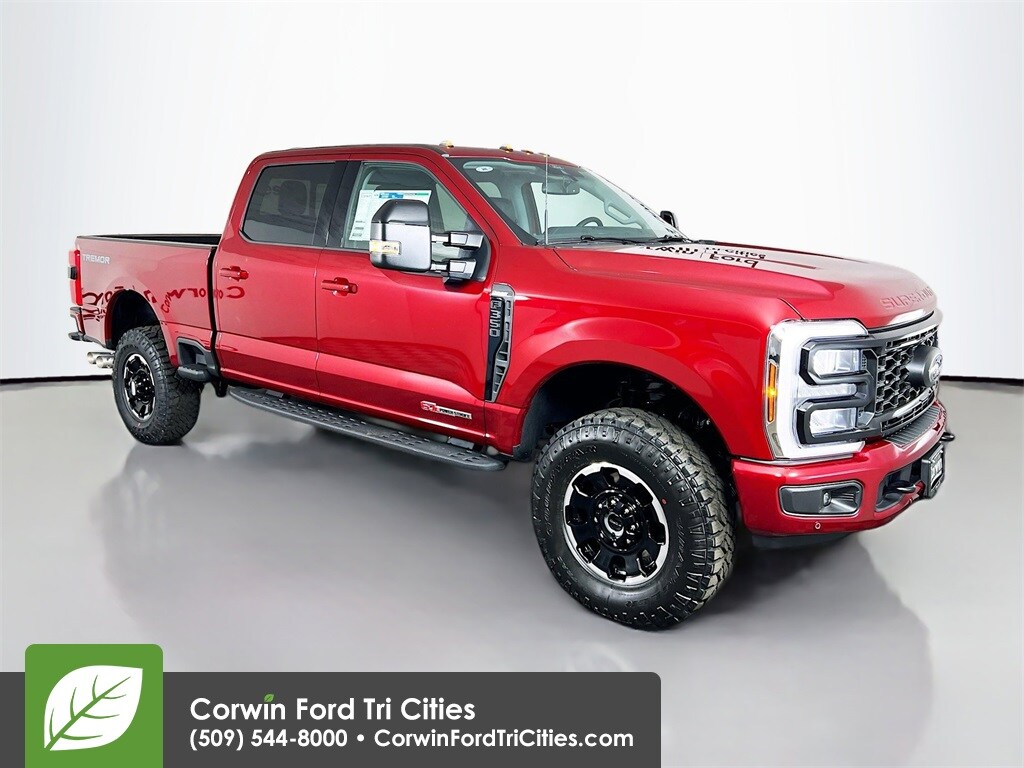 Command our Diesel driven 2025 Ford F-350 Super Duty Lariat Crew Cab 4X4 with the Black Appearance, Tremor and Ultimate Packages and conquer the tough jobs in Ruby Red! Motivated by a TurboCharged 6.7 Liter High Output PowerStroke Diesel V8 serving up 500hp and 1200lb-ft of torque to a 10 Speed Automatic transmission. This Four Wheel Drive also welcomes our Tremor Pack for off-road upgrades like a front limited-slip differential, a rear locking diff, an increased ride height, performance shocks, water-fording vent tubes, robust skid plates, Rock Crawl/Trail Control modes, and enhanced style with power running boards, spray-on Bedliner, a twin panel sunroof, 18-inch alloy wheels, and exclusive graphics.
