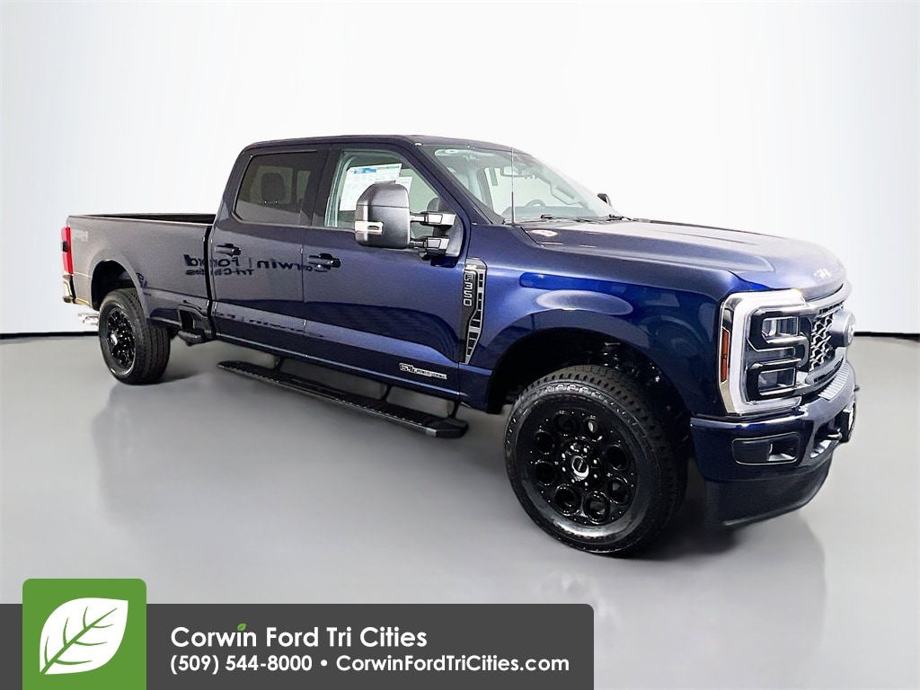 Our diesel-driven 2025 Ford F-350 Super Duty XLT Crew Cab 4X4 with Black Appearance and Premium Packages with the helps meet the grueling demands of the daily grind in Antimatter Blue Metallic! Powered by a TurboCharged 6.7 Liter PowerStroke Diesel V8 supplying 475hp and 1050lb-ft of torque to a 10 Speed Automatic transmission. A robust suspension enables composed handling in this Four Wheel Drive truck, providing added confidence. Our Ford F-350 has confident good looks, too, with jewel-effect headlamps, fog lamps, a bold grille, matching bumpers, a hitch receiver, a spray-on bedliner, a power-lock tailgate, and heated power trailer mirrors.
